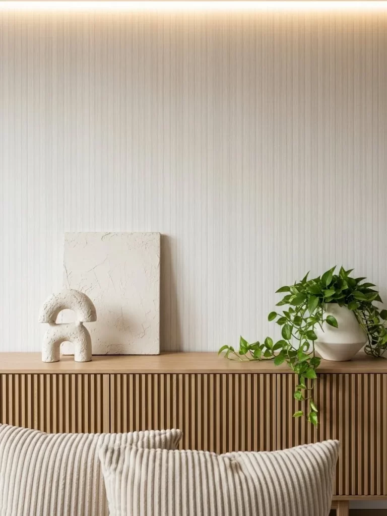 Texture transforms a flat space into a sophisticated sanctuary. This design uses vertical lines to create height and visual interest without relying on loud colors. The soft beige tones keep the room feeling airy while the shadows between the slats provide a rhythmic depth.