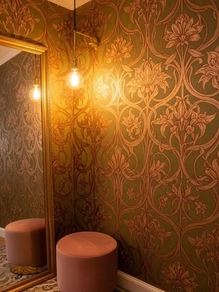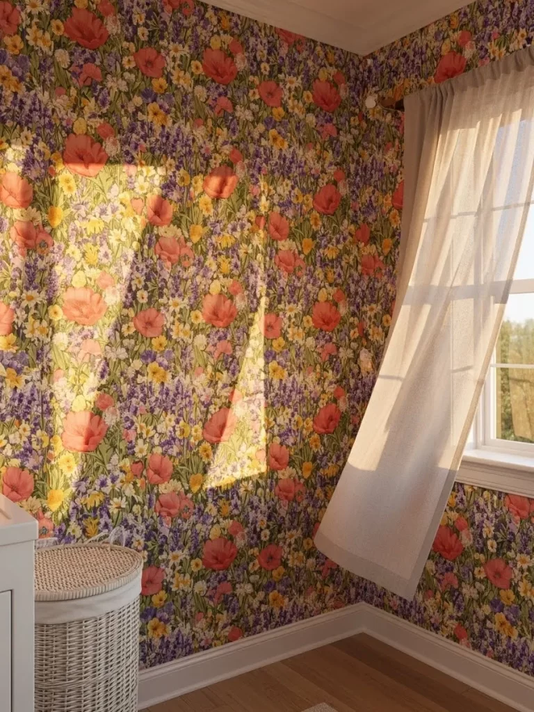 Delicate green fronds and wildflower sketches give this space a timeless, academic atmosphere. The cream background softens the room, making it feel cozy and lived in. This pattern is wonderful for entryways or reading corners where you want a calm, nature inspired vibe.