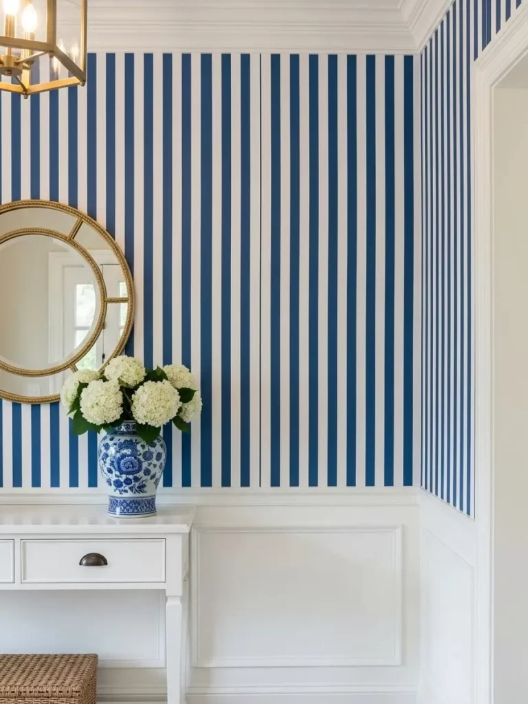 This geometric pattern adds a sharp, architectural feel to a hallway or entryway. The clean black lines on a white background create a sense of order and modern style. It is a bold choice that defines the transition between different rooms in your home.