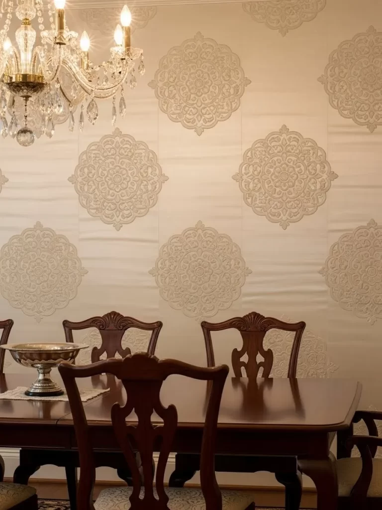 The neutral cream tone keeps the room feeling bright and sophisticated. This pattern pairs with crystal chandeliers and dark wood furniture. It is a smart way to upgrade a rental space without making permanent changes.