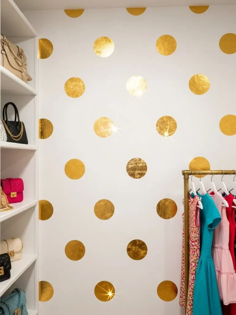 Bring a playful yet high fashion look to your walk in closet with these large metallic gold dots. The white background keeps the space airy while the gold adds a reflected glow. This is an easy way to make your daily routine feel a bit more special.