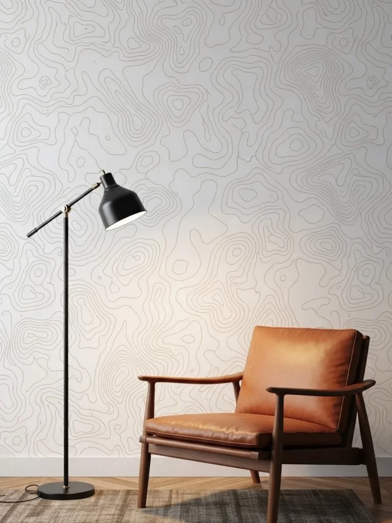 Create a sophisticated and modern look in your lounge with this thin, flowing line pattern. The design mimics the curves of a map, adding a sense of adventure and movement. It is a subtle way to add interest to a large wall without using heavy colors.