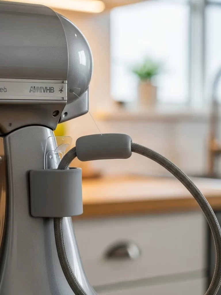 Messy cords behind your stand mixer look disorganized on the kitchen counter. Adding a small adhesive cord wrap keeps everything tucked away neatly. This little plastic tool sticks directly to the back of your appliances. You can finally clear the visual clutter from your food prep area.