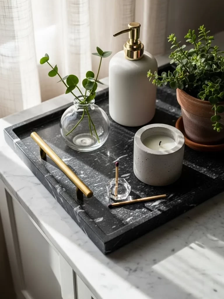Grouping your decorative items on a tray makes the kitchen look organized. A dark marble tray with gold handles looks very high end and stylish. You can place a candle and a small vase on the stone. This creates a cozy focal point on your countertop or kitchen island.