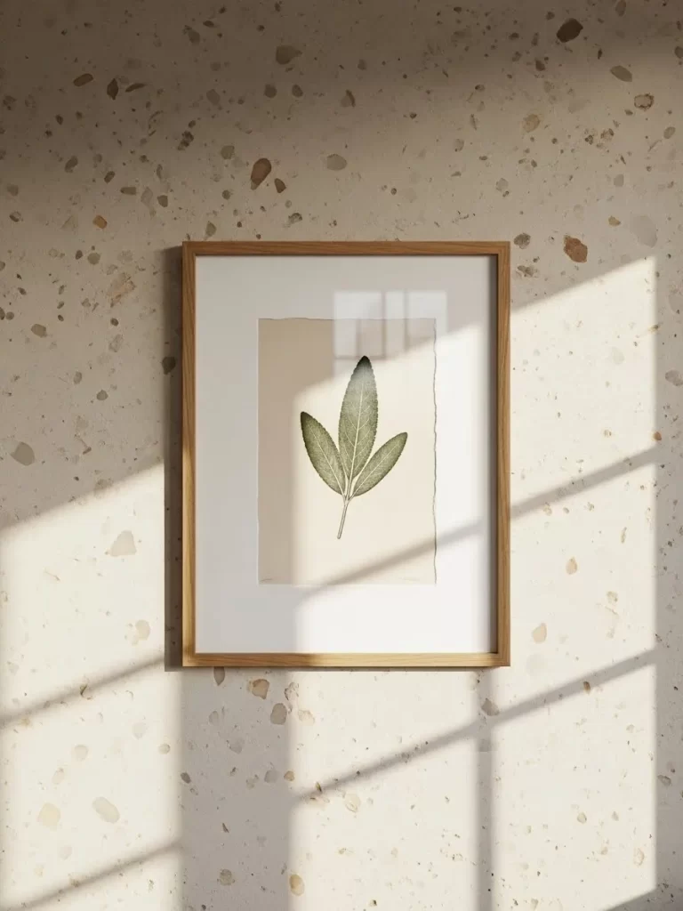 Kitchen walls often lack art compared to the rest of the home. Hanging a simple botanical print brings a sense of calm to the room. This minimalist design features a green leaf on a light background. The wood frame adds warmth to your tiled or painted walls.