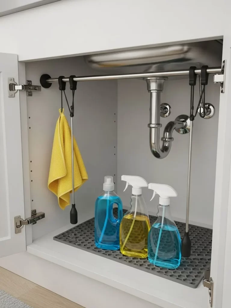 Messy cabinets under the sink often hide valuable storage space. Adding a simple metal tension rod allows you to hang spray bottles by their triggers. This vertical organization frees up the bottom of the cabinet for larger items like buckets or bins. Keeping cleaning supplies visible prevents you from buying duplicates of things you already own.