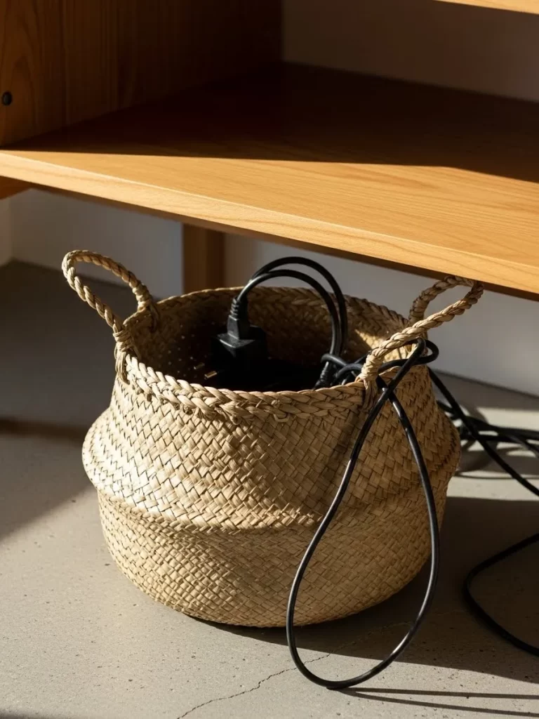 Electronics often clutter a room with messy wires. This simple fix uses a natural basket to hide power strips. You keep your home looking neat without spending much money.