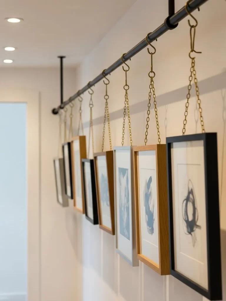 Cables hang down to hold frames at any height you want. This gallery style setup looks professional and very clean. It is a smart way to show off your personal taste. You can move the pictures around without using any new nails.