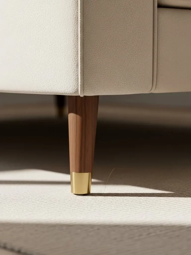 Dated furniture legs can make a nice sofa look cheap. Slipping on brass caps adds a mid century modern touch. This small detail elevates the whole piece of furniture quickly. Your guests will think you bought a brand new set of chairs.