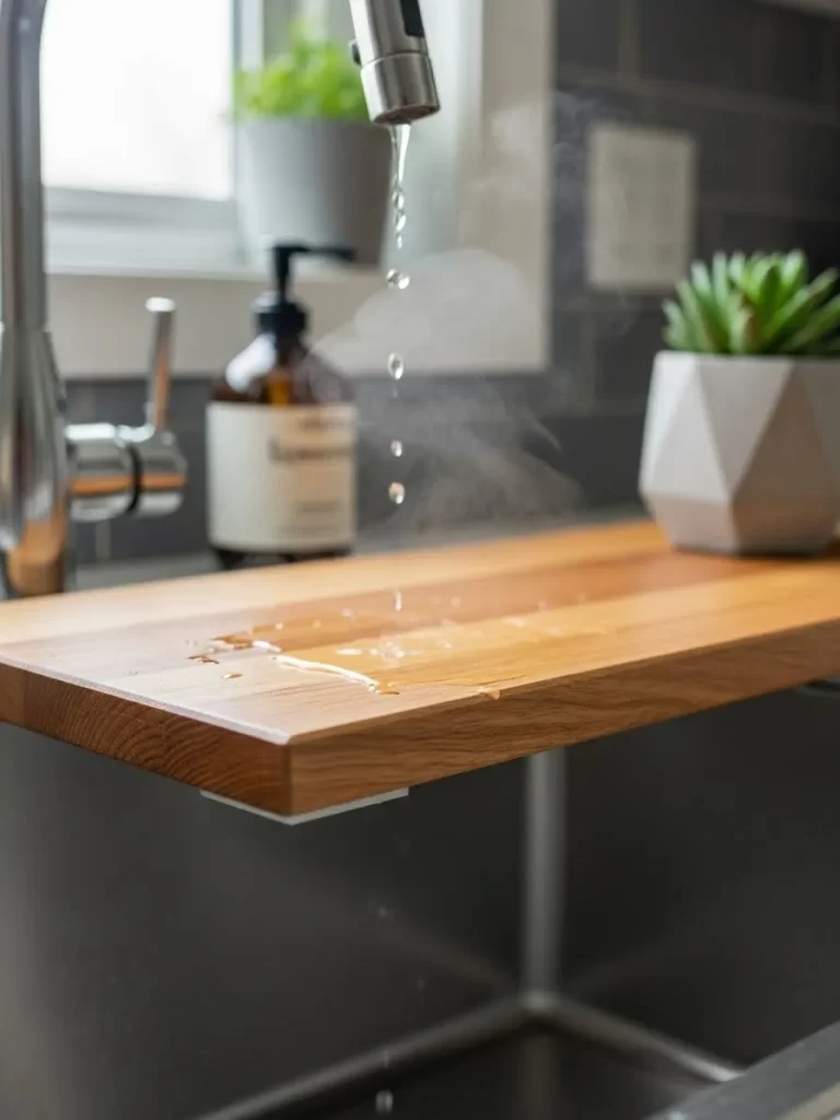 Natural wood brings warmth to a sterile cooking area. The shelf prevents water from pooling on your counters. This hack adds both beauty and function to small units.