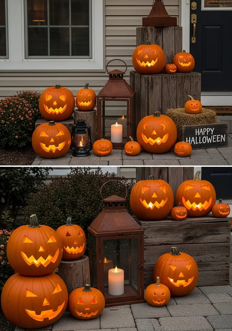 This welcoming entryway is filled with the warm, cheerful glow of jack-o’-lanterns. A large collection of pumpkins in different sizes and shapes is placed on the porch and stairs. The carved faces all have a glowing light inside. The pumpkins are arranged on hay bales and wooden crates, which gives the display a cozy, rustic feel. A large, rusty lantern with a candle inside adds to the warm, inviting mood.