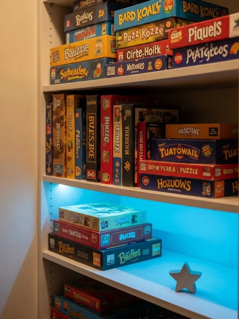 - Stack smaller games on the upper shelves, making sure they are centered.