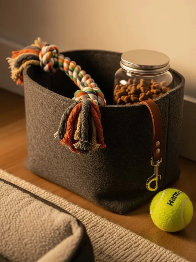 Pet toys and leashes can easily get scattered across the living room floor. This project uses a soft felt bin to keep your dog’s favorite ropes and tennis balls in one spot. A glass jar with a metal lid keeps treats fresh and prevents them from spilling.