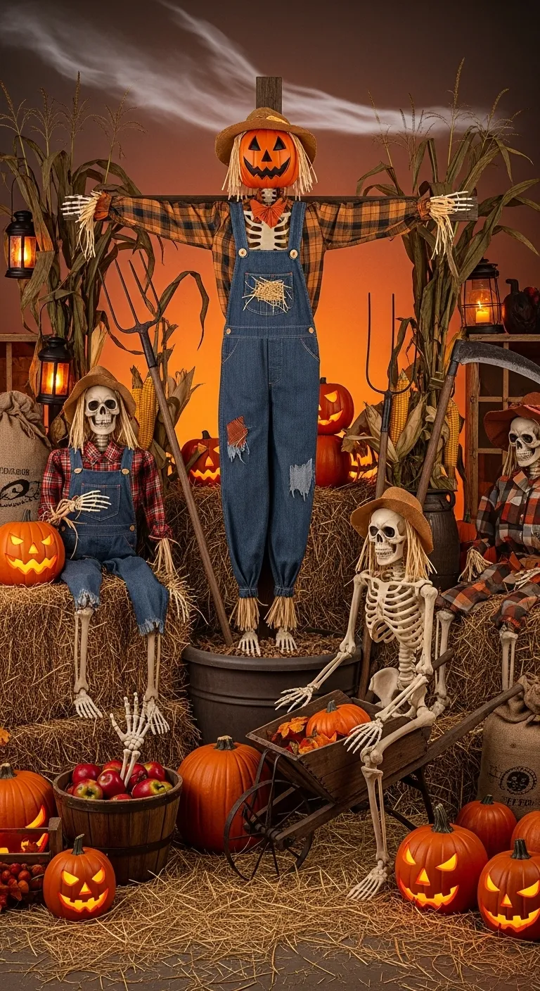 These are not your average scarecrows. In this spooky harvest scene, skeletons have taken over the pumpkin patch. Dressed in flannel shirts and overalls, they guard the fields with a sinister grin.