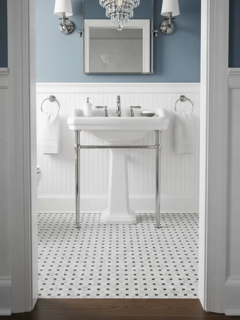 Classic white subway tiles on the walls reflect light to keep the area bright. A light wood vanity provides storage while looking lightweight and modern. The blue crown molding at the top adds a unique pop of color that draws the eye upward.