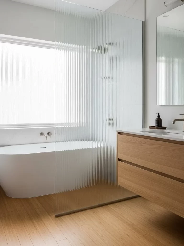 A frameless glass partition separates the shower while keeping the floor plan open. The small white hexagon floor tiles add a subtle pattern that feels soft underfoot. This design is all about using light and shadow to create a modern and spacious feel.