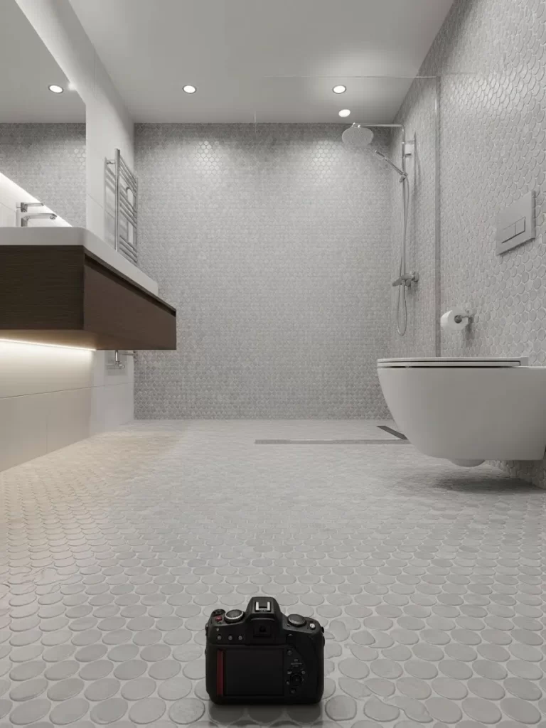 - Apply the 3D geometric tiles to the back shower wall, checking for a level fit.
