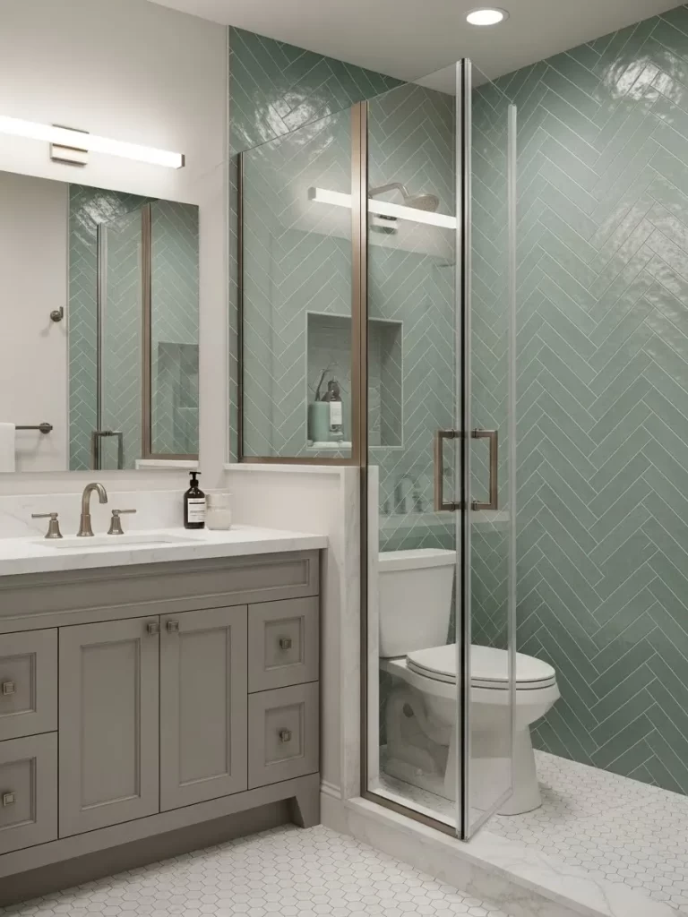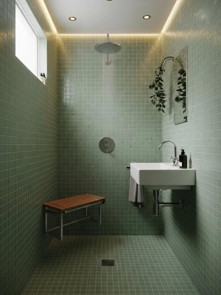 Small bathrooms often feel chopped up by different flooring and wall materials. This layout uses a single sage green tile for every surface to create a unified look. The consistent color stretches the visual boundaries of the room.