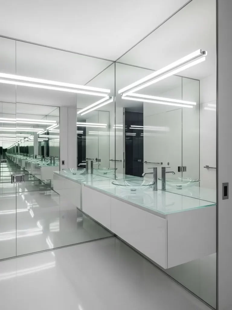 Strategic lighting placed underneath the cabinet creates a soft glow. This makes the floor area look wider and brighter. A wall mounted faucet keeps the counter clear and organized.