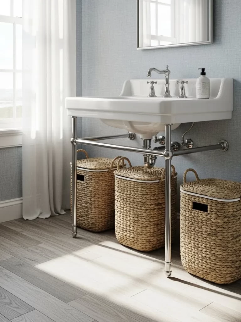 Vertical storage is your best friend in narrow rooms. Always look for empty wall space above the toilet or sink to add shelves or racks.