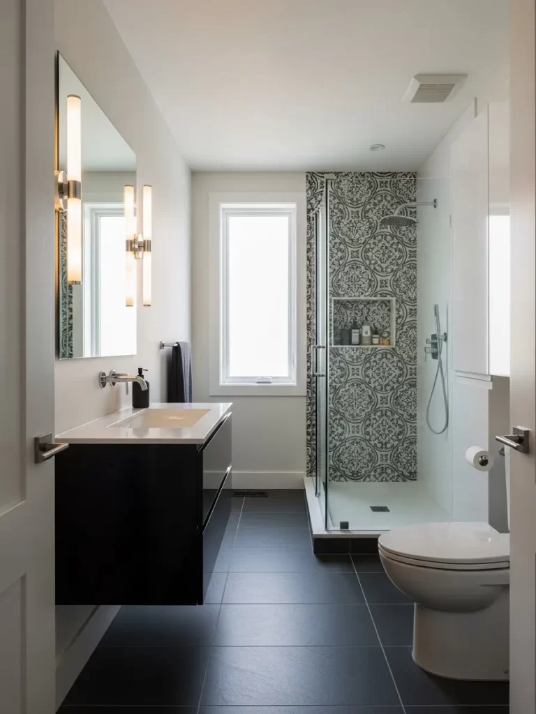 High contrast colors can make a small bathroom feel incredibly stylish and deep. This room uses a patterned tile wall in the shower to create a strong focal point. The black floating vanity provides a sharp, modern look against the white walls.