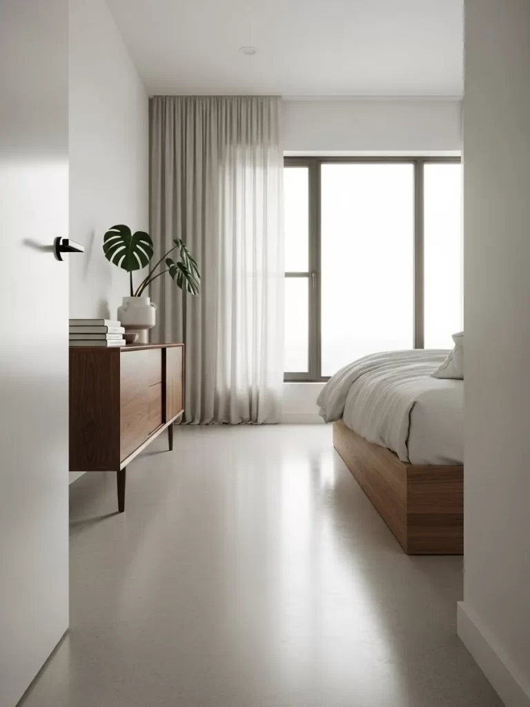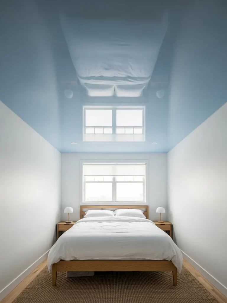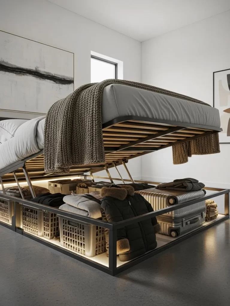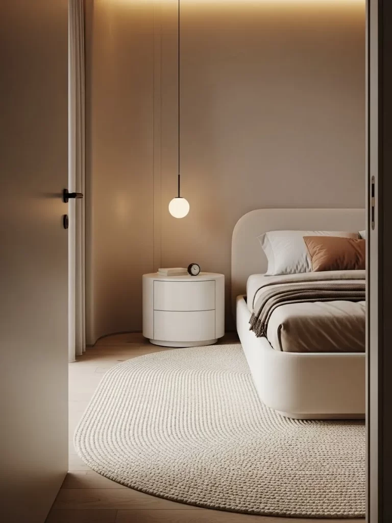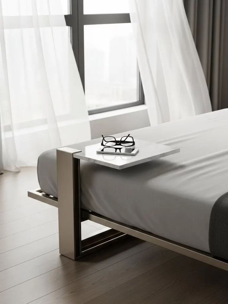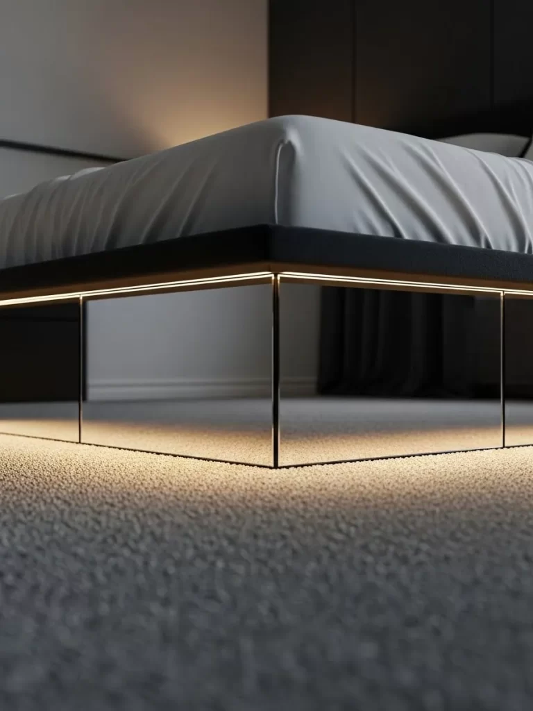 Standard bed legs can be a visual distraction in a small, minimalist room. This layout uses a bed frame with a recessed mirror base that creates a stunning “floating” illusion. At night, integrated LED strips under the frame glow against the carpet for a futuristic look.