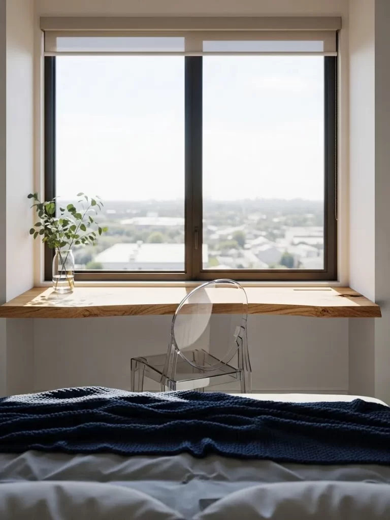 Heavy furniture can often make a small room feel crowded and dark. This layout uses a bed frame made entirely of clear acrylic to create a floating effect. Light passes straight through the frame, which makes the floor space look much larger than it is.