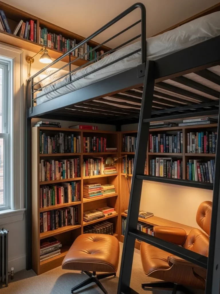 Going vertical is the best solution when you lack square footage. This sturdy black metal loft bed lifts the sleeping area toward the ceiling to free up the floor. Below the mattress, a cozy reading nook features floor to ceiling bookshelves and a comfortable lounge chair.