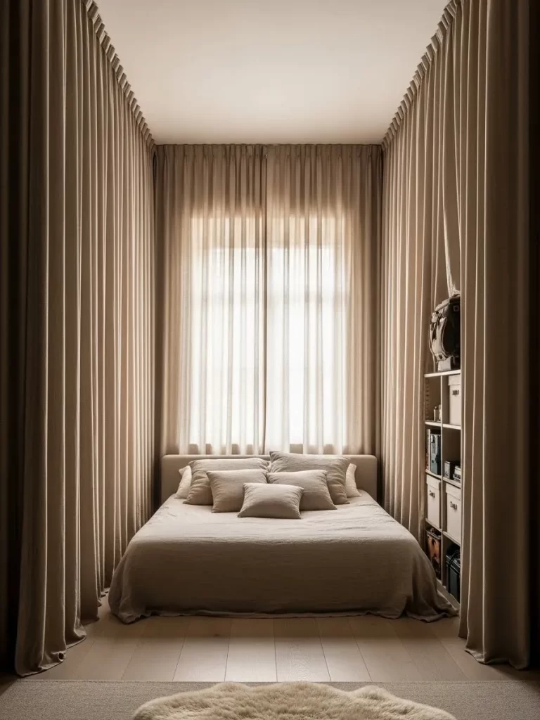 Soft ripples in the fabric add a touch of texture without feeling heavy. You can easily push them to one side to let the full sun in. It is a simple way to make a tiny bedroom feel airy and open.