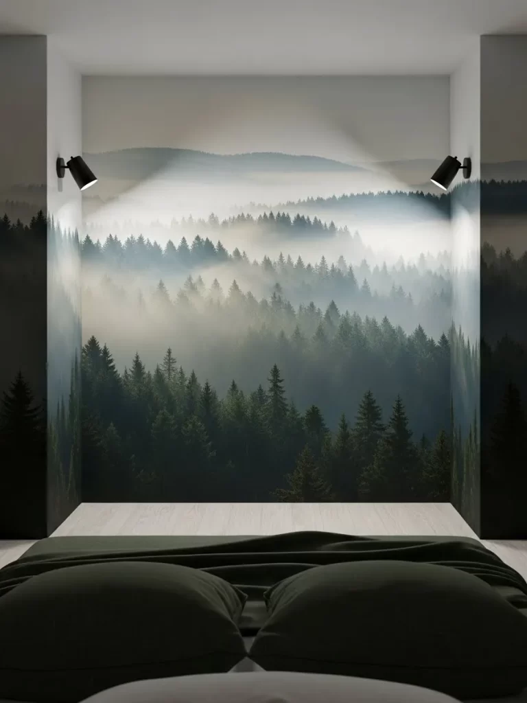 When a room feels small and enclosed, a mural can break the walls and add a sense of infinite distance. This layout features a full wall mural of a misty evergreen forest that surrounds the headboard. It creates a deep, atmospheric backdrop that makes the bedroom feel like a peaceful clearing.