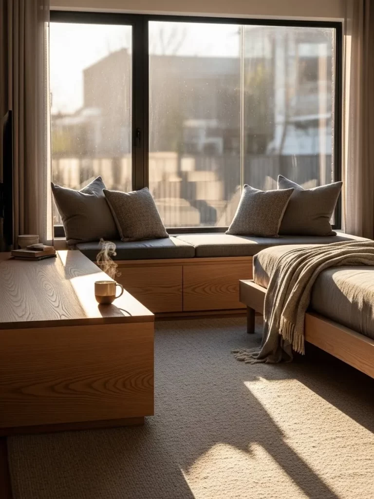 Windows are often underutilized in small rooms, but this layout turns the ledge into a functional seat. A custom wooden bench sits flush against the glass, offering a peaceful spot to sit and watch the world. Below the seating cushion, large drawers provide hidden space for extra blankets or shoes.