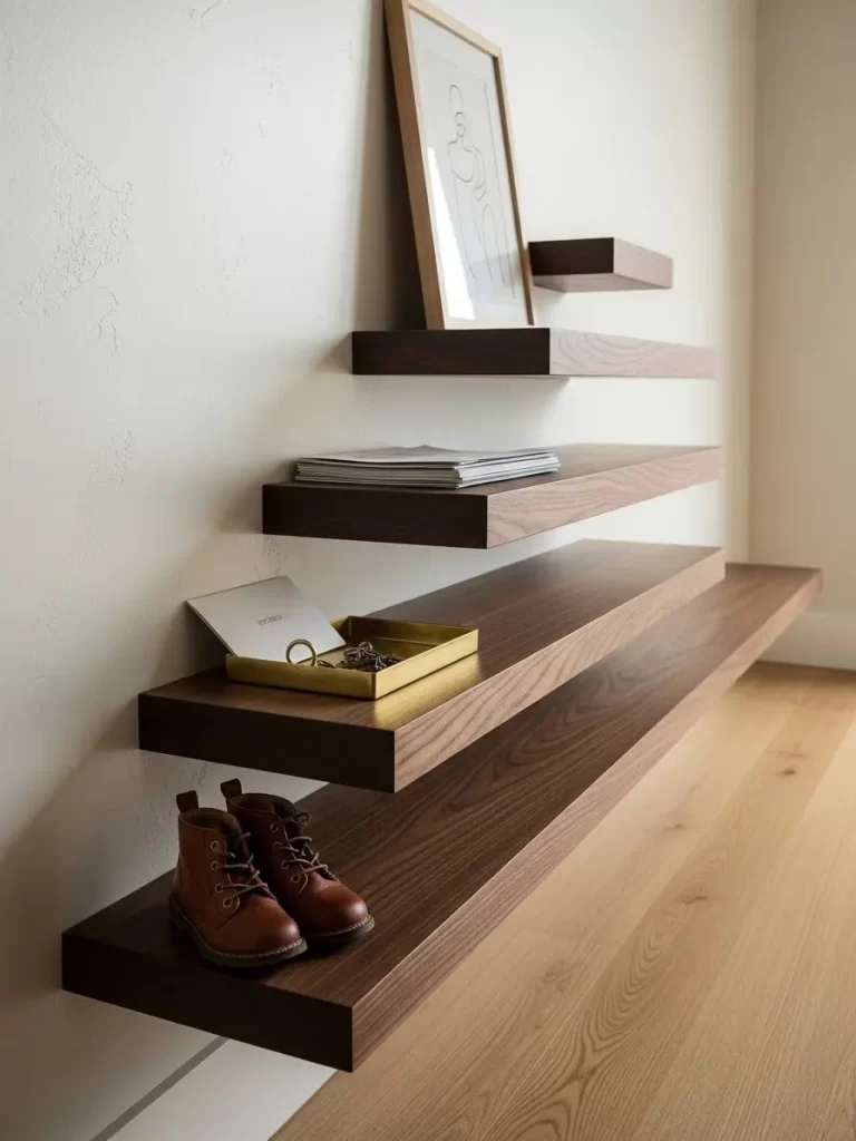 Maintaining a clear walkway is vital in tight corridors. By mounting everything to the wall, you remove the visual weight of traditional furniture legs. This layout keeps your entryway feeling airy and organized without sacrificing style.