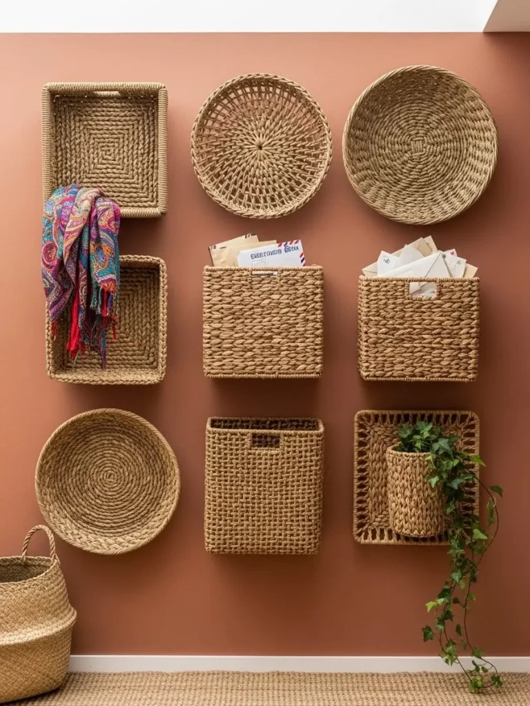 - Three woven storage baskets