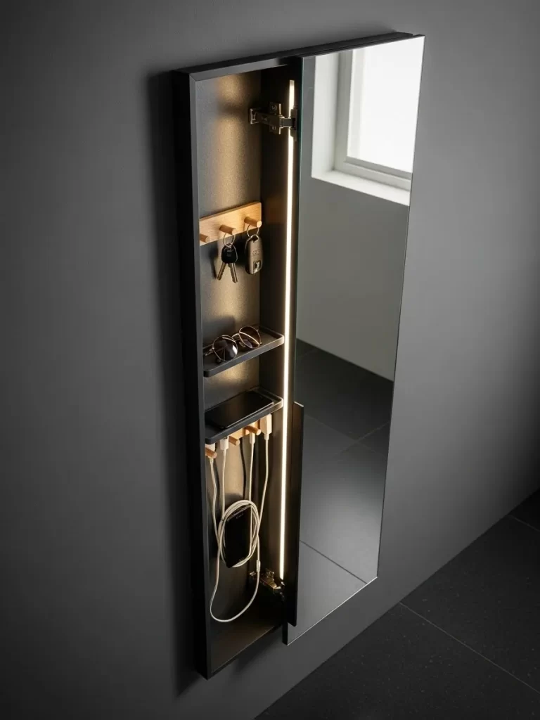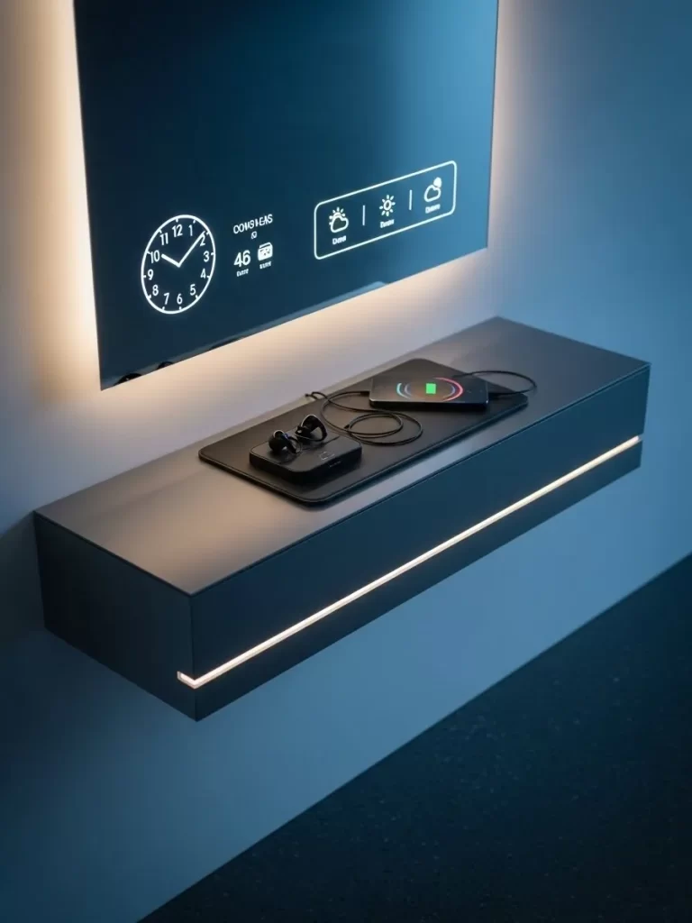 Modern entryways can embrace the future with integrated smart technology. This layout features a gray floating console with a built-in charging pad. A smart mirror above displays the time, weather, and your daily calendar.