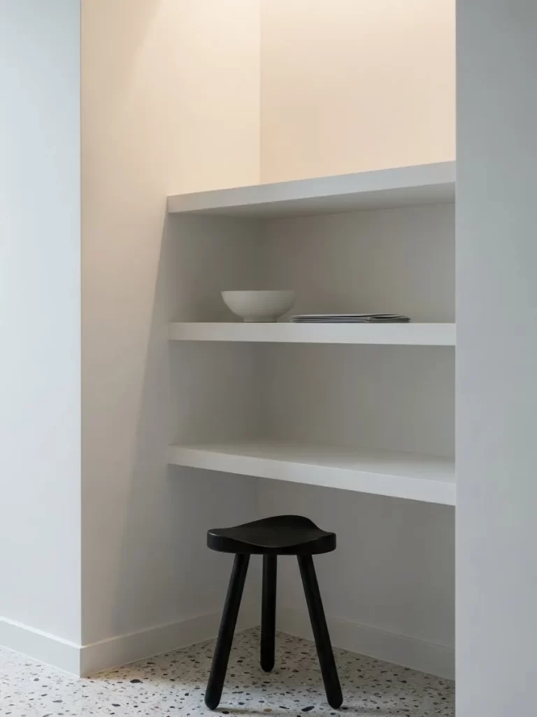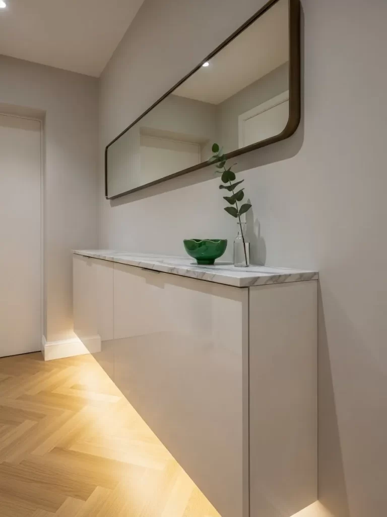 Long, narrow hallways often suffer from a lack of light and functional storage. This ultra-slim floating console features a white high-gloss finish that blends seamlessly into the wall. A luxurious marble top adds a touch of elegance while providing a surface for small decor and a catch-all bowl.