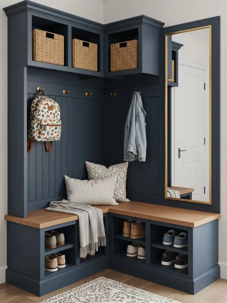 Transforming a dead corner into a functional zone is a smart move for busy households. This custom-built mudroom features a deep navy blue finish that hides scuffs and adds sophisticated color. The L-shaped bench offers plenty of room to sit down and put on shoes comfortably.