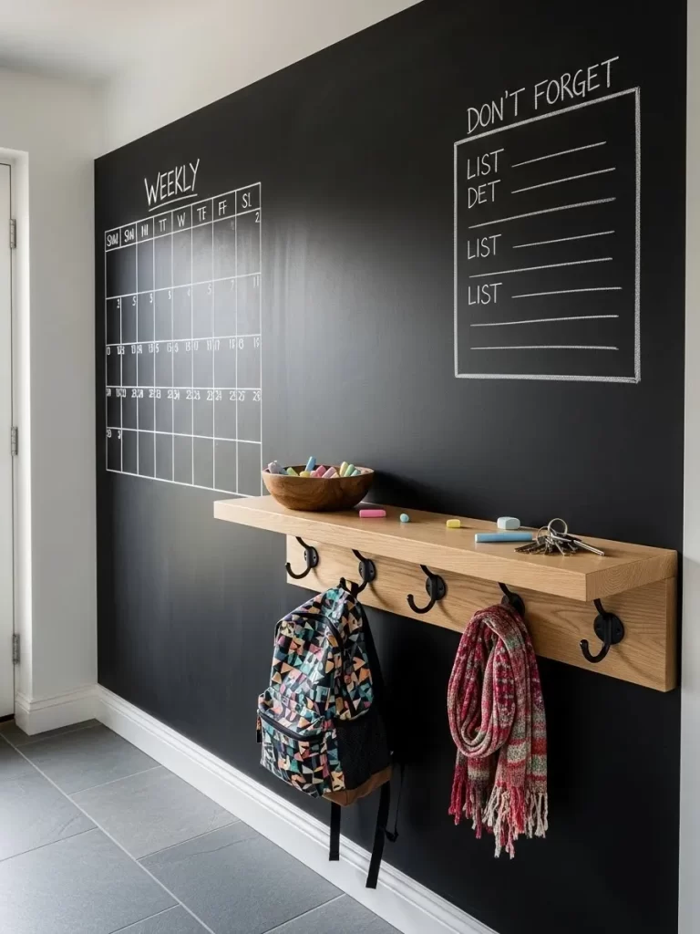 The dark gray wall helps the digital displays pop and remain very readable. It eliminates the need for separate clocks and messy charging cables for phones. This design keeps your foyer functional and very clean in a high-tech way.