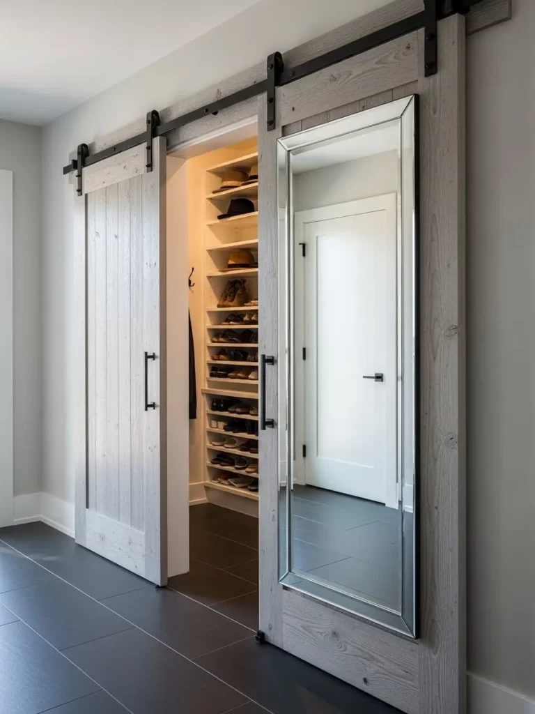 Sliding barn doors are a smart way to hide a messy entryway closet. This set features a rustic gray wood finish that adds texture to the foyer. A full-length mirror is built into one of the panels for last-minute checks.