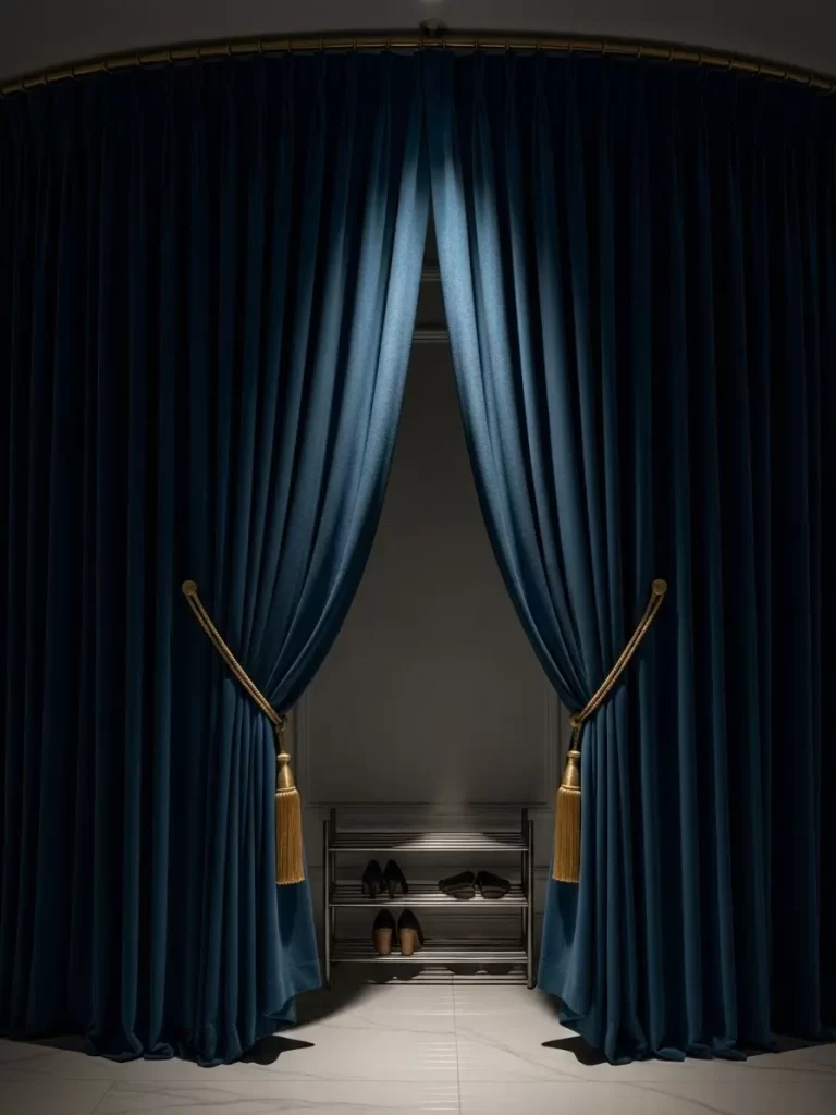 Curtains are a soft and elegant way to divide a foyer from a storage room. This pair of deep blue velvet drapes adds a dramatic touch of luxury. They hide a metal shoe rack and coat storage when you have guests.