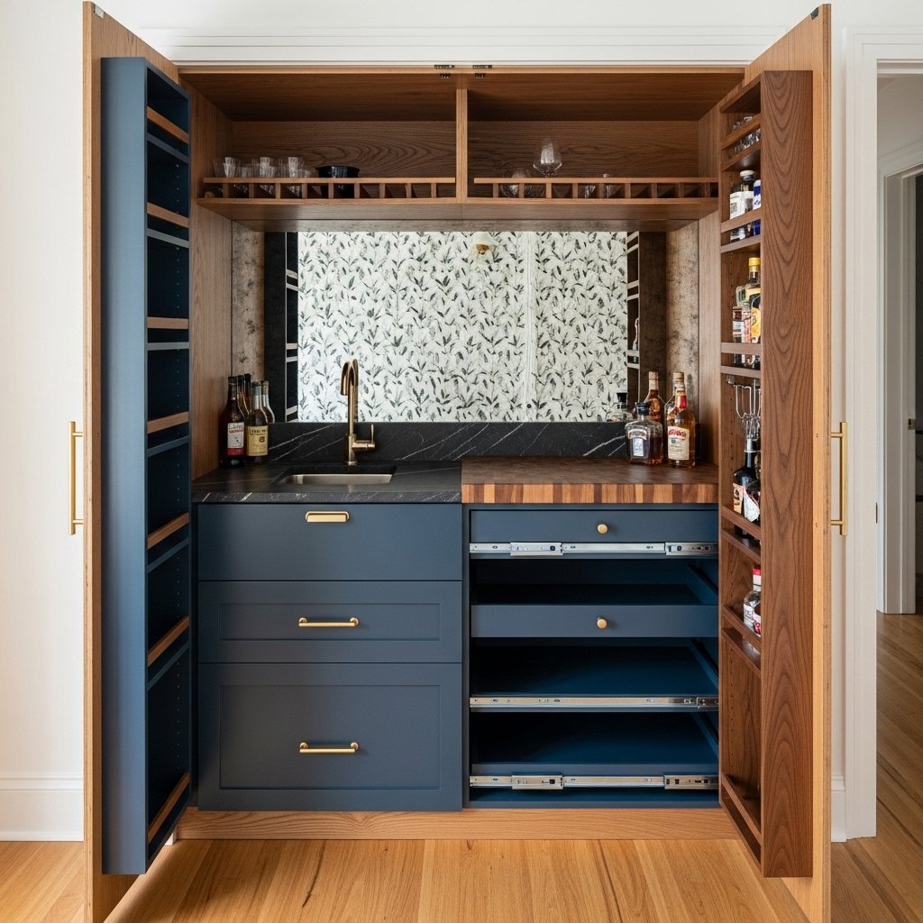 A rich combination of materials creates a luxurious feel. Deep blue cabinetry pairs beautifully with warm walnut, black stone, and elegant gold hardware. The doors themselves are masterpieces of storage, lined with tiered shelving, while a patterned backsplash adds a touch of art.