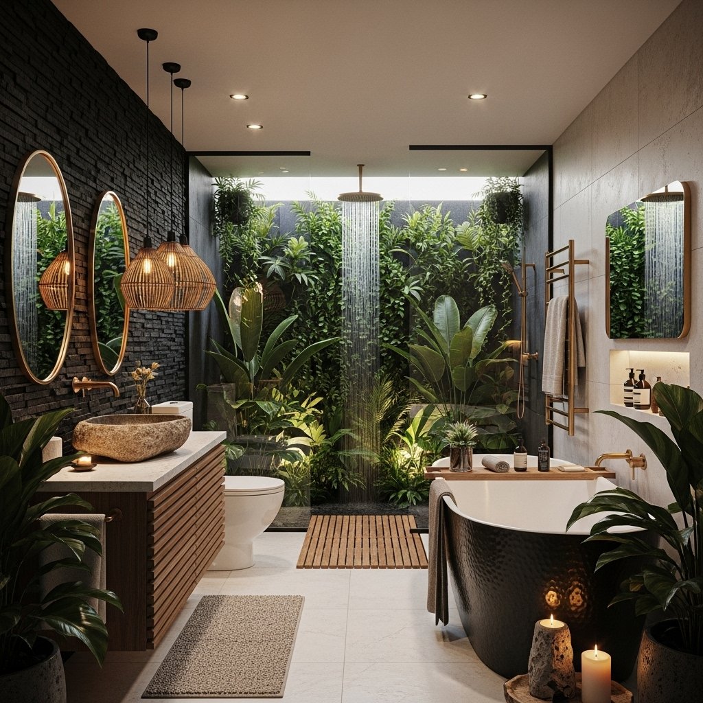This bathroom creates a private tropical oasis, blurring the line between indoors and out. The entire back wall of the shower is a lush, living garden of tropical plants. A rainfall showerhead lets water cascade down through the leaves for a unique experience.