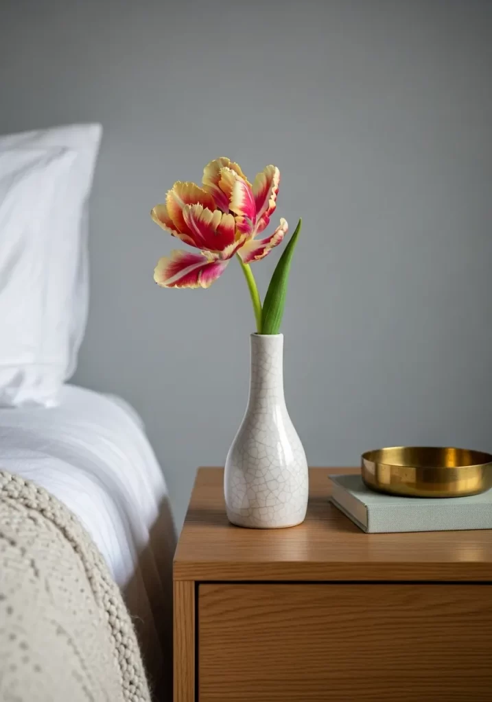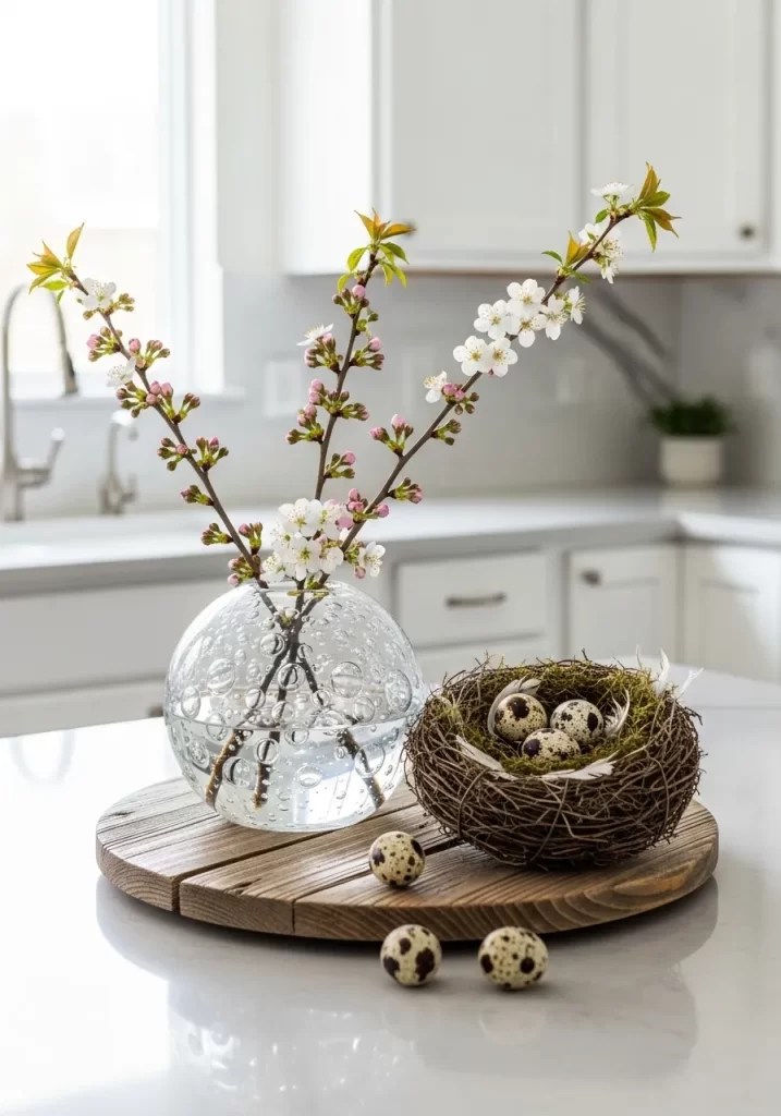 Integrating organic elements brings an immediate sense of renewal to a space. It feels like a fresh garden path has been lifted and placed gently on your mantle. This design works well because it uses height and negative space to maintain a light, breezy atmosphere. You can easily adapt this look for any seasonal shift by simply swapping the flower varieties.