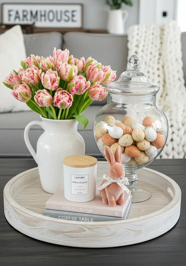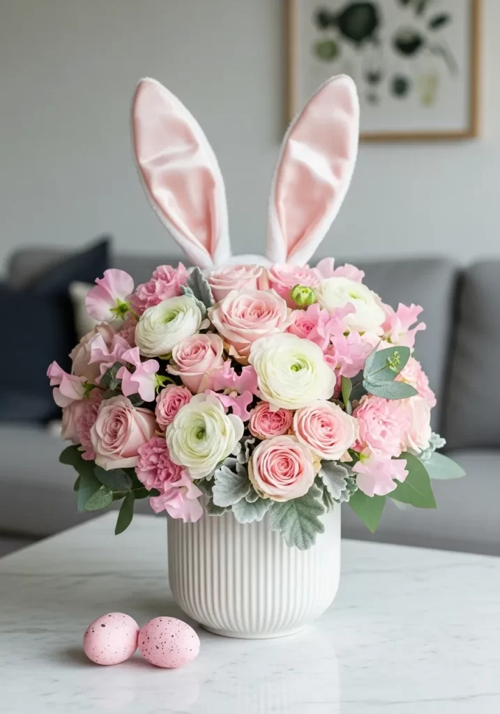 This arrangement is a fun conversation starter that guests will enjoy. The soft pink and white tones keep the look elegant despite the whimsical theme. By using a tight cluster of flowers, the bunny ears look like they are part of a crown worn by the bouquet. It is a simple way to celebrate the holiday while maintaining a high style aesthetic.