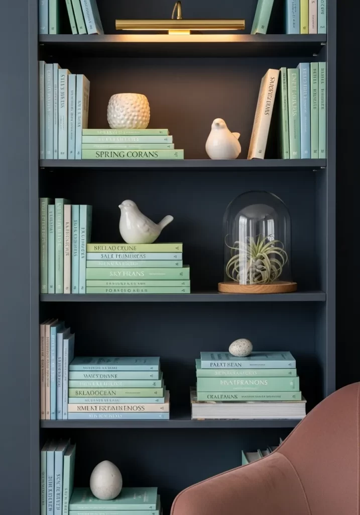 Incorporating animal motifs into a bookshelf makes the display feel more dynamic and less like a static storage unit. The birds look as if they are hopping from shelf to shelf, leading the eye through your collection. By keeping the color of the figurines consistent, the look remains sophisticated and adult. This is a great way to add a layer of storytelling to your home decor.