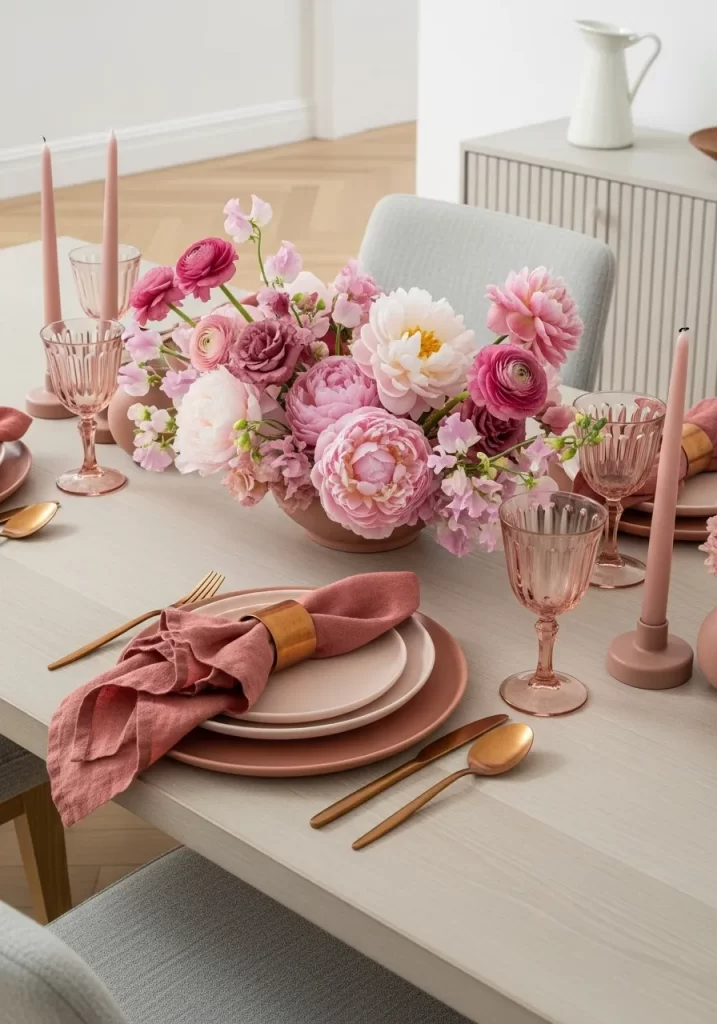 Soft blush tones and deep mauves create a sophisticated dining experience that feels modern and warm. This tablescape ditches high contrast colors for a cohesive palette of pinks. Matte clay plates stacked in varying shades add depth without cluttering the visual field. Elegant rose tinted glassware catches the light, while slender taper candles provide a vertical element to the arrangement.