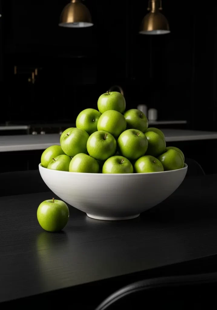 Create a striking and edible centerpiece by stacking vibrant green apples in a large white ceramic bowl. This display uses color and repetition to create a high contrast focal point against a dark, moody dining room background. The smooth, matte finish of the white bowl perfectly complements the waxy sheen of the Granny Smith apples. One lone apple placed on the table nearby adds a touch of artistic imperfection.