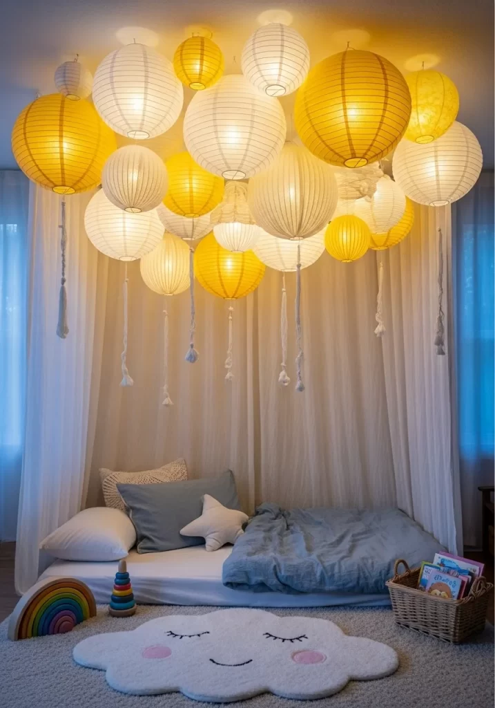 Transform a simple floor bed into a dreamlike sanctuary with a massive installation of white and yellow paper lanterns. This design features dozens of lanterns in various sizes suspended from the ceiling to create a glowing cloud above the sleeping area. The mix of soft white and warm yellow light filters through the paper, casting a gentle, flattering glow over the room. Below, a cloud shaped rug and rainbow toys add to the whimsical, cozy atmosphere.