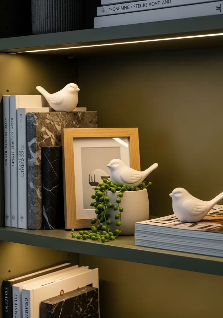 Bring a sense of peace and movement to your library with a collection of matte white bird figurines. This shelf display uses olive green and dark grey backgrounds to make the white ceramic birds stand out. They are perched on stacks of books and even on the edge of a small potted String of Pearls plant. The warm LED strip lighting under each shelf highlights the smooth curves of the birds and the texture of the marble patterned books.
