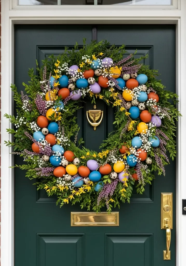 This wreath moves away from the usual pale pastels and embraces a more saturated, earthy palette. It feels sophisticated and handmade, offering a warm welcome to any guest. The mix of natural textures and smooth eggshells creates a visual interest that draws the eye from the street.