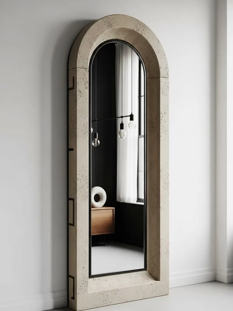 This captivating full length mirror, aptly named the Arched Desert Mirror, brings a touch of ancient architecture into a modern home. Standing tall on the floor, its distinctive feature is the thick, textured frame crafted from a material resembling speckled, sun baked stone or concrete. The frame forms a graceful arch at the top, immediately softening the vertical lines of the space while simultaneously lending it considerable visual weight.